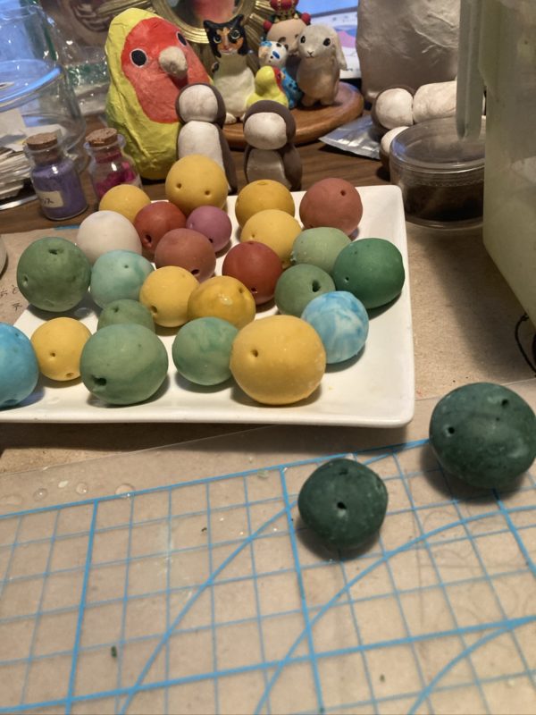 春分の日の今日は、樹脂粘土で光のコトリ粒を作った。
